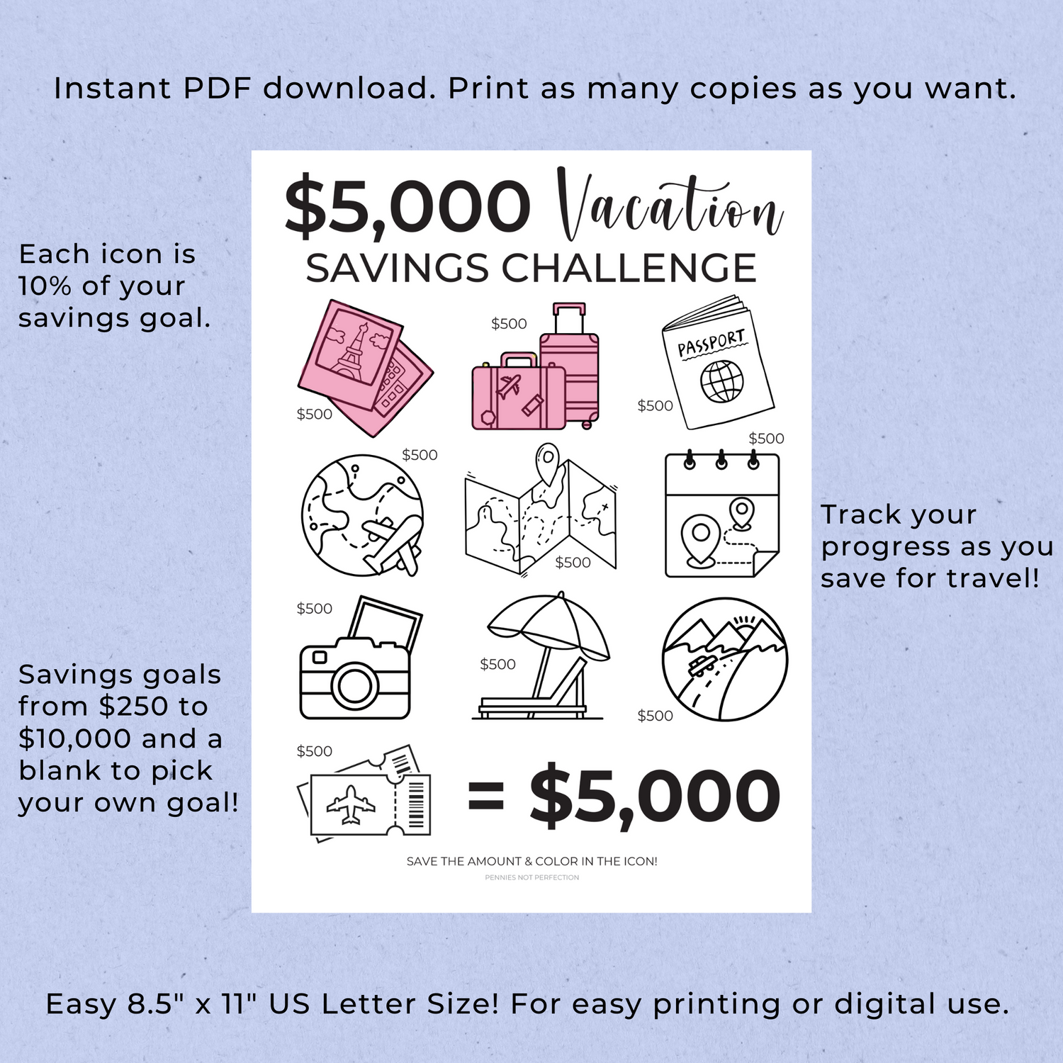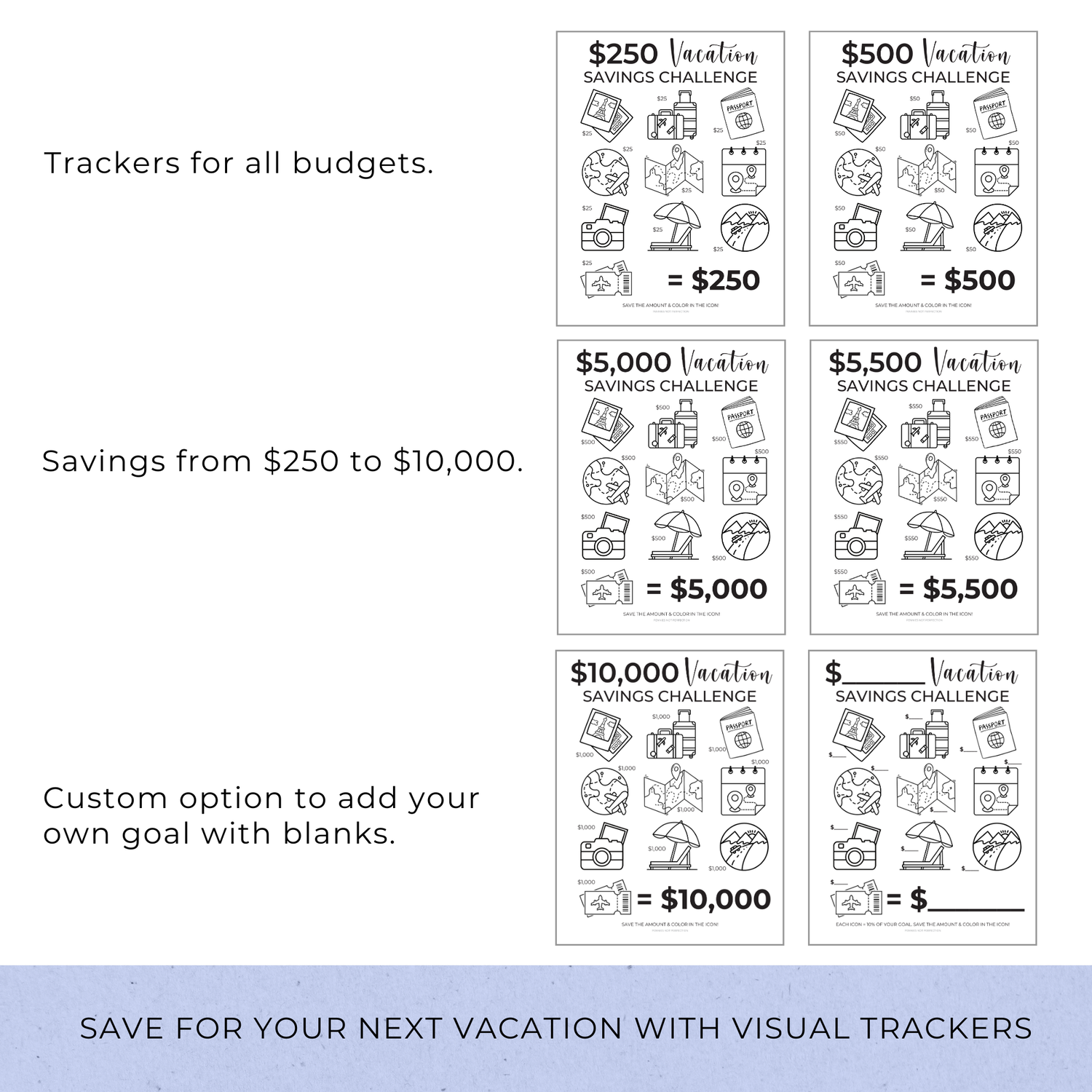 There is also a BLANK option included where you can write in your own custom vacation savings goal. Then each icon is 10% of that goal amount.